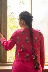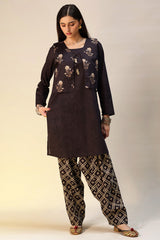 Classic-fit shirt with a round neckline, Styled with a classic-fit short front-open sleeveless koti featuring tassel detailing. Paired with a coordinated printed classic-fit shalwar.