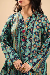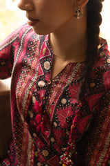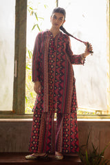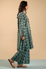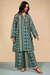 Classic-fit printed shirt with a round neckline and V-slit, adorned with tassel detailing. Finished with coin accents along the sleeve hems. Paired with matching printed culottes.