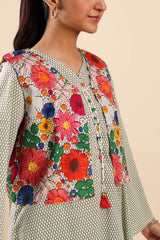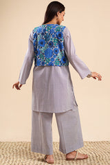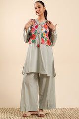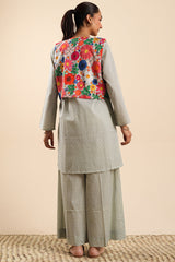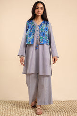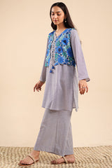 Classic-fit printed shirt with a V-neckline, adorned with loop button detailing along the front slit. Styled with a vibrant printed, classic-fit short front-open sleeveless koti featuring tassel accents. Paired with matching printed culottes.
