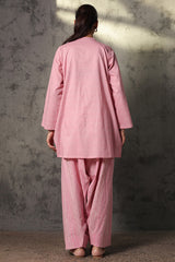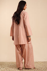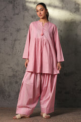Classic fit gathered shirt with a round neckline, adorned with tassel detailing along the v-slit. Gathers around the empire waist create a flowy silhouette. Paired with a coordinated printed farshi shalwar.