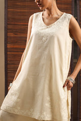 Embroidered classic-fit shirt crafted on a soft muslin mulmul base, with a V-neckline, adorned with delicate self-embroidered detailing. Comes with an inner for added comfort and ease. Paired with gold-printed flared trousers.