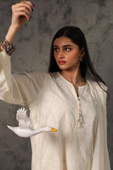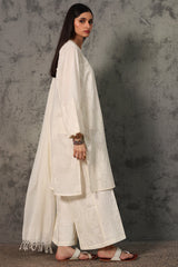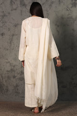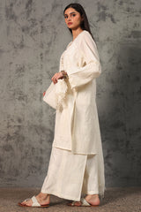 Embroidered classic-fit shirt with a round neckline and V-slit accented with tassel and button detailing. Handmade crochet lace adorns the sleeve hems. Comes with an inner for added comfort and ease. Paired with matching embroidered culottes and styled with a cotton check dupatta.