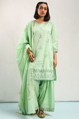 Hand-embroidered classic-fit shirt with a round neckline, featuring a side slit with loop button detailing. Finished with gota lace along the sleeve hems. Paired with a farshi shalwar adorned with embroidered borders and complemented with a lurex-accented dupatta.