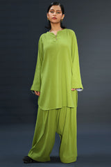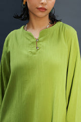 Relaxed-fit textured shirt with a round neckline and buttoned slit. Designed with fluid sleeves and subtle drop shoulders. Paired with matching farshi shalwar of a modern silhouette.