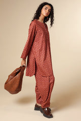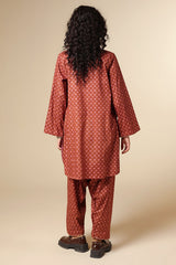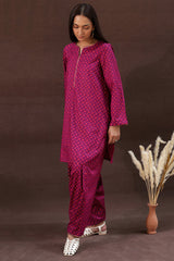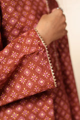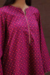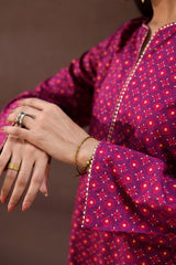 A classic-fit printed shirt with a round neckline and V-slit, adorned with gota lace detailing on the neckline and sleeve hems. Paired with a matching printed classic-fit shalwar, finished with gota lace on the hemline.