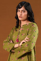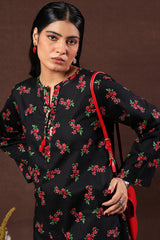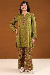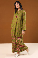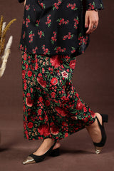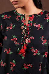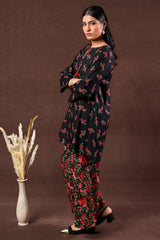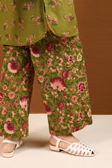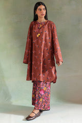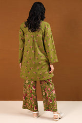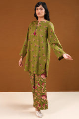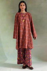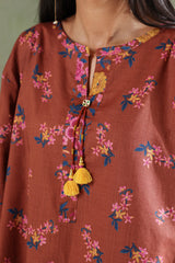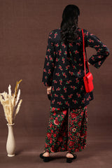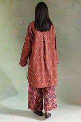 A classic-fit printed shirt with a round neckline and V-slit adorned with tassel detail, a rounded hem, and a back pleat for added ease. Paired with matching printed culottes.