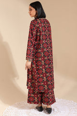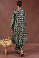 Classic-fit A-line printed shirt with a round neckline and V-slit, adorned with delicate embroidery along the neckline and sleeve hems. Paired with matching printed culottes.