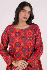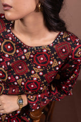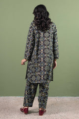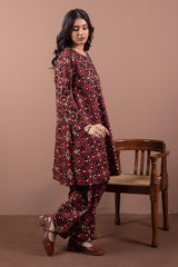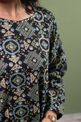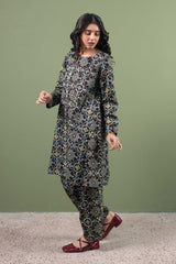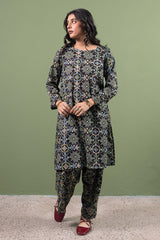A printed A-line shirt with mukaish detailing on the neckline. Paired with matching printed classic-fit shalwar for a coordinated, stylish look.