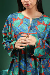 Classic-fit A-line paneled printed shirt with a round neckline and V-slit, adorned with delicate embroidery along the neckline and sleeve hems. Paired with matching printed straight-fit trousers.
