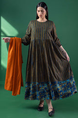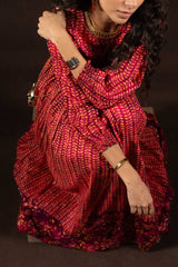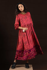 A long, flared printed dress with a round neckline, designed with soft gathers at the waist to accentuate its graceful flare. Gathered sleeve hems add delicate structure and a refined finish.