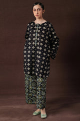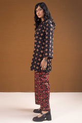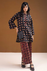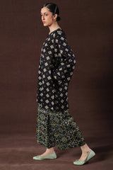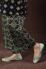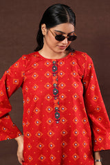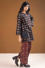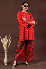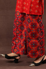 A vibrant Ajrak-printed short shirt with a round neckline and front button placket, paired with classic printed culottes for a chic, coordinated look.