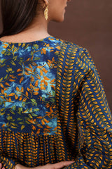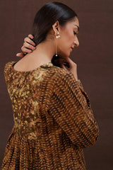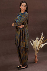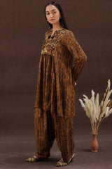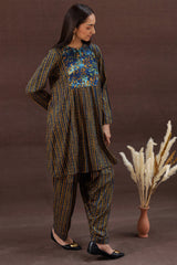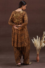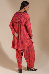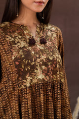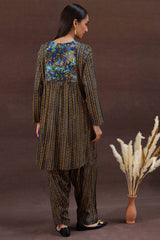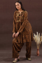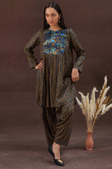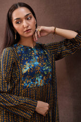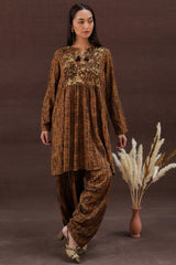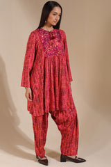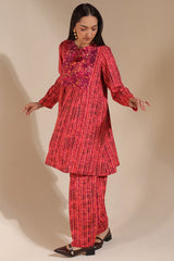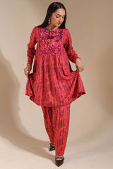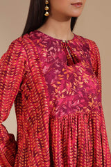 A printed flared shirt with a keyhole neckline and tassel detailing, enhanced with gathers for volume. Paired with matching -printed classic-fit shalwar for a coordinated look.