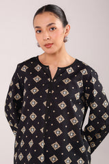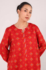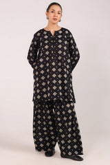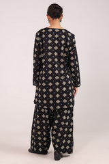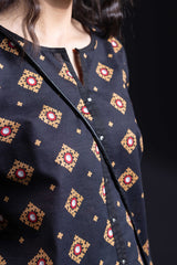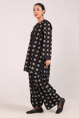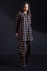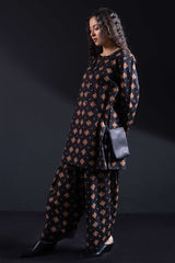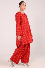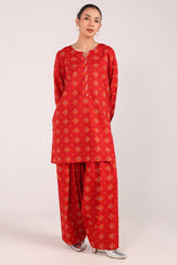 A vibrant printed shirt with a round neckline and V-slit, paired with matching printed farshi shalwar featuring intricate stitching detail on the ankle hemline.