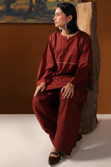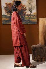 Printed in deep hues, this classic-fit shirt features a round neckline with a V-slit, adorned with gota lace detailing on the bodice. Paired with a matching printed farshi shalwar, enhanced with stitching details for a timeless look.