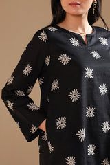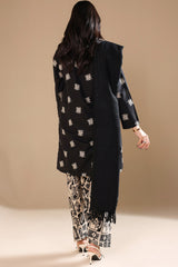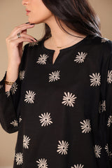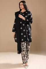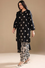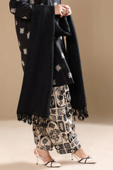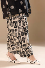 A classic-fit printed shirt with a low band neckline and V-slit, featuring side pockets. Paired with a complementary printed classic-fit shalwar finished with stitching detail along the ankle hem for a touch of understated elegance.