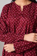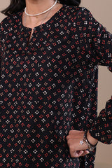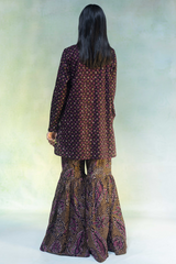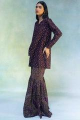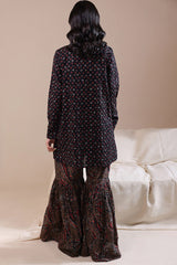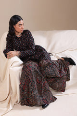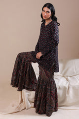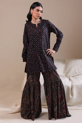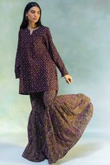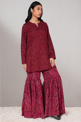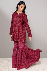 A classic-fit printed short shirt with a round neckline and V-slit, paired with a matching printed gharara for a graceful, traditional look.