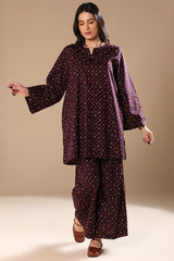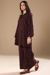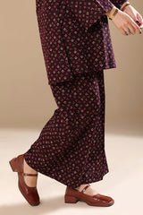 An A-line printed shirt with a round neckline and V-slit, adorned with tassel detailing. Paired with matching printed culottes for a coordinated look.