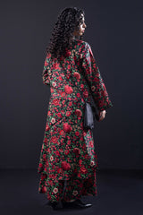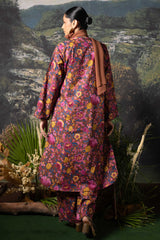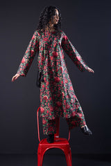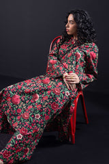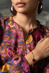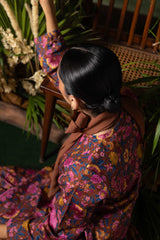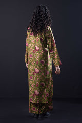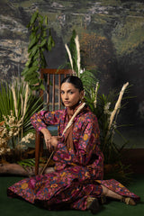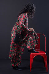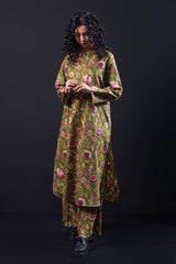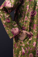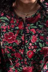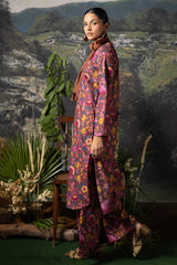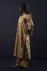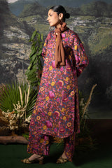 A floral-printed shirt featuring a low band neckline and V-slit, detailed with a front zipper. Side pockets provide added comfort and functionality. It is paired with matching printed culottes for a coordinated and stylish ensemble.