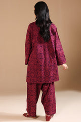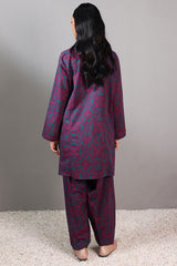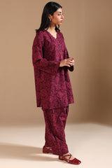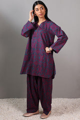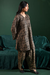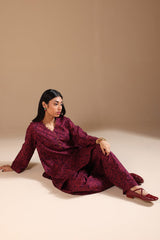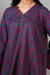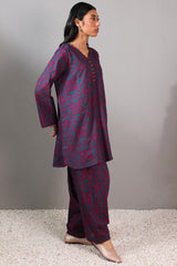 A relaxed-fit printed shirt with a V-neckline adorned with loop details and a rounded hem. Paired with matching printed classic-fit shalwar for a coordinated look.