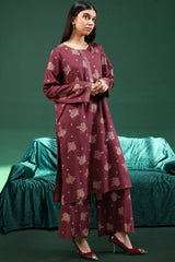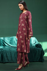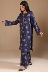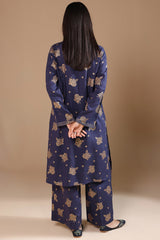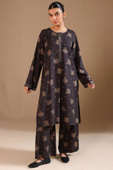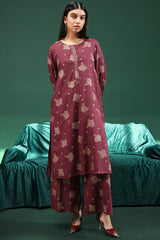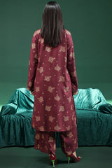 A classic-fit printed shirt with a round neckline and V-slit, featuring delicate stitching details along the front placket and sleeve hems. Side pockets add ease. Paired with matching printed culottes.