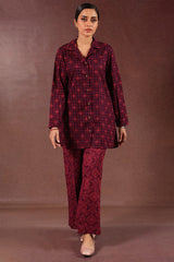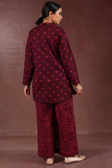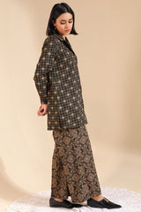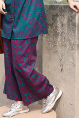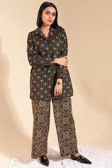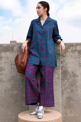 A classic-fit printed shirt with a collared neckline and buttons along the front placket, paired with complementary printed culottes for a coordinated look.