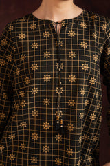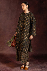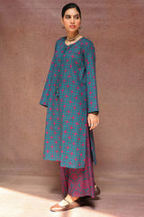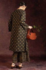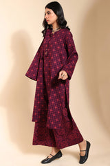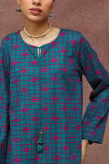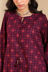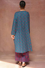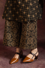 A classic-fit printed shirt with a round neckline and V-slit, adorned with tassel detailing. Paired with printed culottes for a refined look.