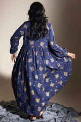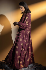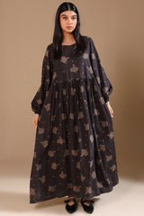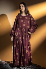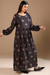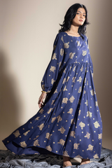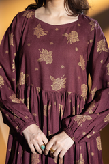Long, flared floral printed dress with cinched sleeves and soft gathers along the empire waist for ease and movement.