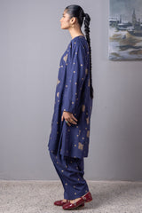 Classic-fit printed shirt with a round neckline and V-slit, adorned with delicate stitching detail. Paired with matching printed culottes for a relaxed yet refined look.