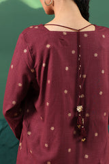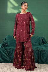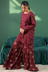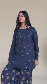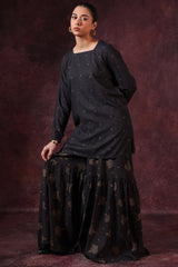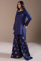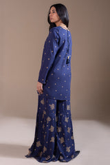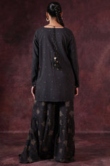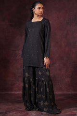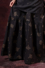 Printed short shirt with a square neckline, featuring gota tassel detailing at the back. Paired with a floral printed gharara for a festive, playful finish.