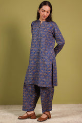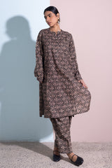 A classic-fit paneled printed shirt with a round neckline and V-slit, adorned with buttons along the front placket. Paired with a matching printed classic-fit shalwar.