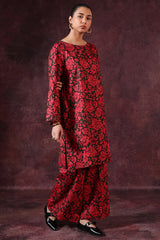 Classic-fit floral printed shirt with a round neckline, adorned with delicate mukaish detailing. Paired with matching printed culottes.