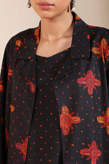 A classic-fit printed shirt with a round neckline and sleeveless cut, paired with printed culottes. The co-ord set is styled with a front-open printed collared shirt for a chic, layered look.