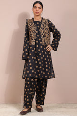 A classic-fit printed shirt with a round neckline, paired with a matching printed classic-fit shalwar. The set is styled with a front-open printed short koti featuring frilled edges and tassel detailing for a playful, layered look.