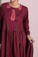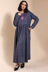 Classic-fit long flared printed dress with a round neckline and Anarkali-style bodice, adorned with dori piping and button detailing. Finished with gathered waist and buttoned sleeve hems.