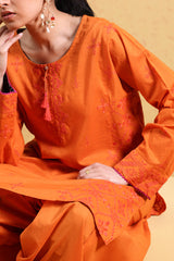 An embroidered classic-fit kurta with a round neckline and V-slit, adorned with tassel detailing. Features crochet lace accents on sleeve hems. Paired with a farshi shalwar embellished with embroidery along the borders.
