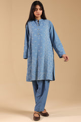 Sashiko stitched classic-fit paneled shirt with a low band neckline and a buttoned front placket. Paired with a classic-fit shalwar, finished with subtle stitching detailing along the ankle hemline for a refined artisanal finish.