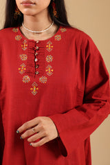 Embroidered paneled kurta featuring delicate pleats and button detailing along the front slit, enhanced with delicate embroidery. Paired with a classic-fit shalwar and styled with a jacquard-bordered dupatta.