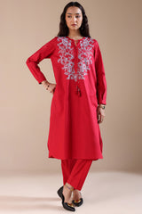 Embroidered classic-fit shirt with a round neckline and a keyhole detail, adorned with tassel accents. Finished with cuffed sleeves and a rounded shirt hem. Paired with straight-fit trousers.