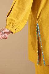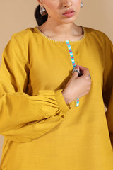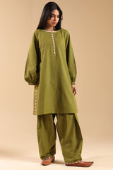 Classic-fit shirt with a round neckline, adorned with delicate stitching details. Embroidered accents enhance the front and side slits, while cuffed sleeve hems add a refined finish. Paired with a khula poncha shalwar, detailed with embroidery along the hemline.