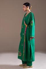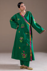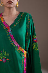 Hand-embroidered angrakha-style paneled shirt, adorned with delicate handcrafted detailing throughout and finished with a printed border. Paired with classic straight-fit trousers.