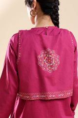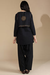 Hand-embroidered short, front-open, sleeveless koti layered over a classic-fit shirt, accented with subtle stitching along the neckline and sleeve hems. Paired with a farshi shalwar.