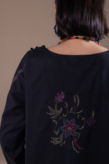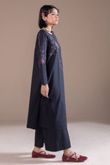 Hand-embroidered classic-fit paneled shirt with a round neckline, finished with button detailing on the shoulder and sleeve-hem slits. Paired with classic culottes for a balanced, artisanal look.