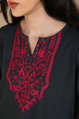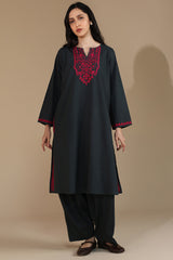 Hand-embroidered classic-fit shirt with a round neckline and a V-slit, adored with vibrant embroidered detailing. Paired with a classic-fit shalwar for a refined silhouette.