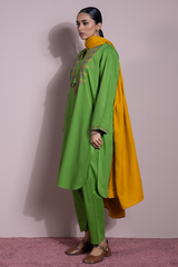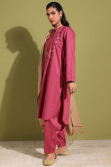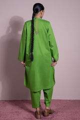 Classic-fit embroidered shirt with a low band neckline and V-slit adorned with tassel detailing. Heart-to-heart embroidery enhances the design, finished with a round shirt hem and paired with a classic-fit shalwar.