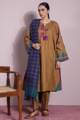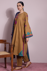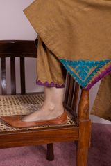 An appliquéd panel shirt with a round neckline and V-slit, adorned with playful tassel detailing. The speckled base is enhanced with appliqué and embroidered accents. Paired with straight-fit trousers featuring appliqué work along the hemline.
