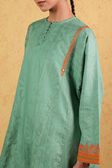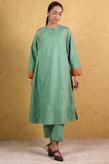 Jacquard paneled kurta with a round neckline, detailed with pleats and buttons along the front slit. Delicate embroidery enhances the shoulders, side slits, and sleeves, complemented by jacquard-patterned sleeve hems. Paired with classic straight-fit trousers for a refined, coordinated look.