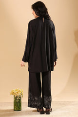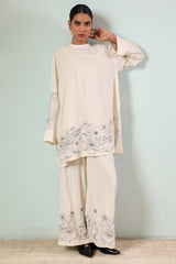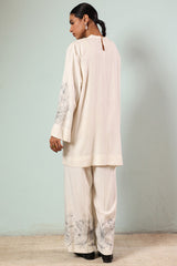 Embroidered classic-fit shirt with a band neckline and a back slit. Designed with subtle drop shoulders. Paired with embroidered culottes.