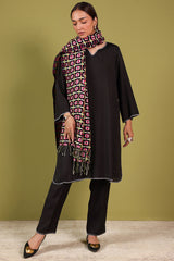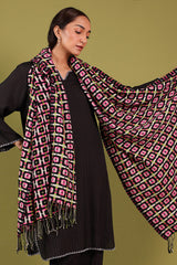 Woven warm shawl featuring geometric patterns and twisted thread fringes along the edges, creating a bold yet playful statement look.