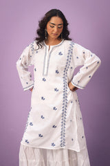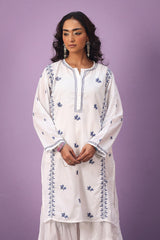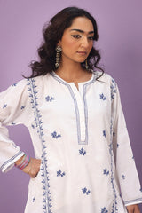 A straight-fit embroidered kurta featuring a round neckline with a V-slit, elegantly adorned with delicate stitch detailing. The panels are enriched with embroidered bails, while the sleeve hems showcase intricate embroidered accents. Scattered floral embroidered motifs add a touch of timeless charm. Pair it with any generation bottom for a versatile and refined look.