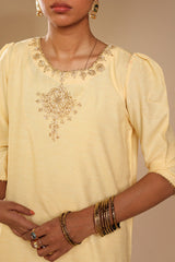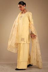 Embroidered classic-fit shirt with a round neckline and subtle puff sleeves, finished with delicate gota lace detailing along the sleeve hems. Paired with a coordinated farshi shalwar with gota detailing along the border. Comes with an inner for added comfort and styled with an embroidered organza dupatta featuring gota detailing along the borders.